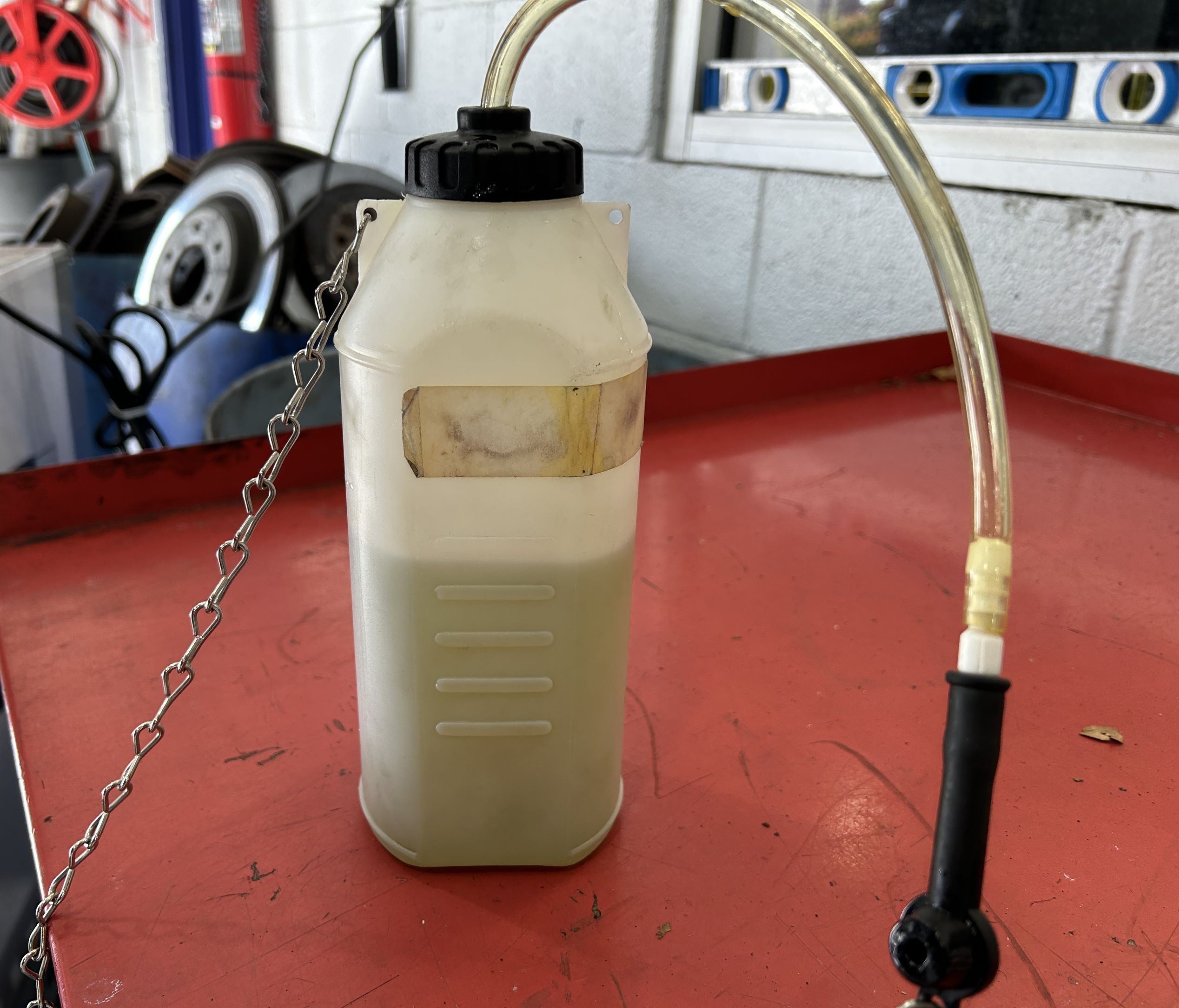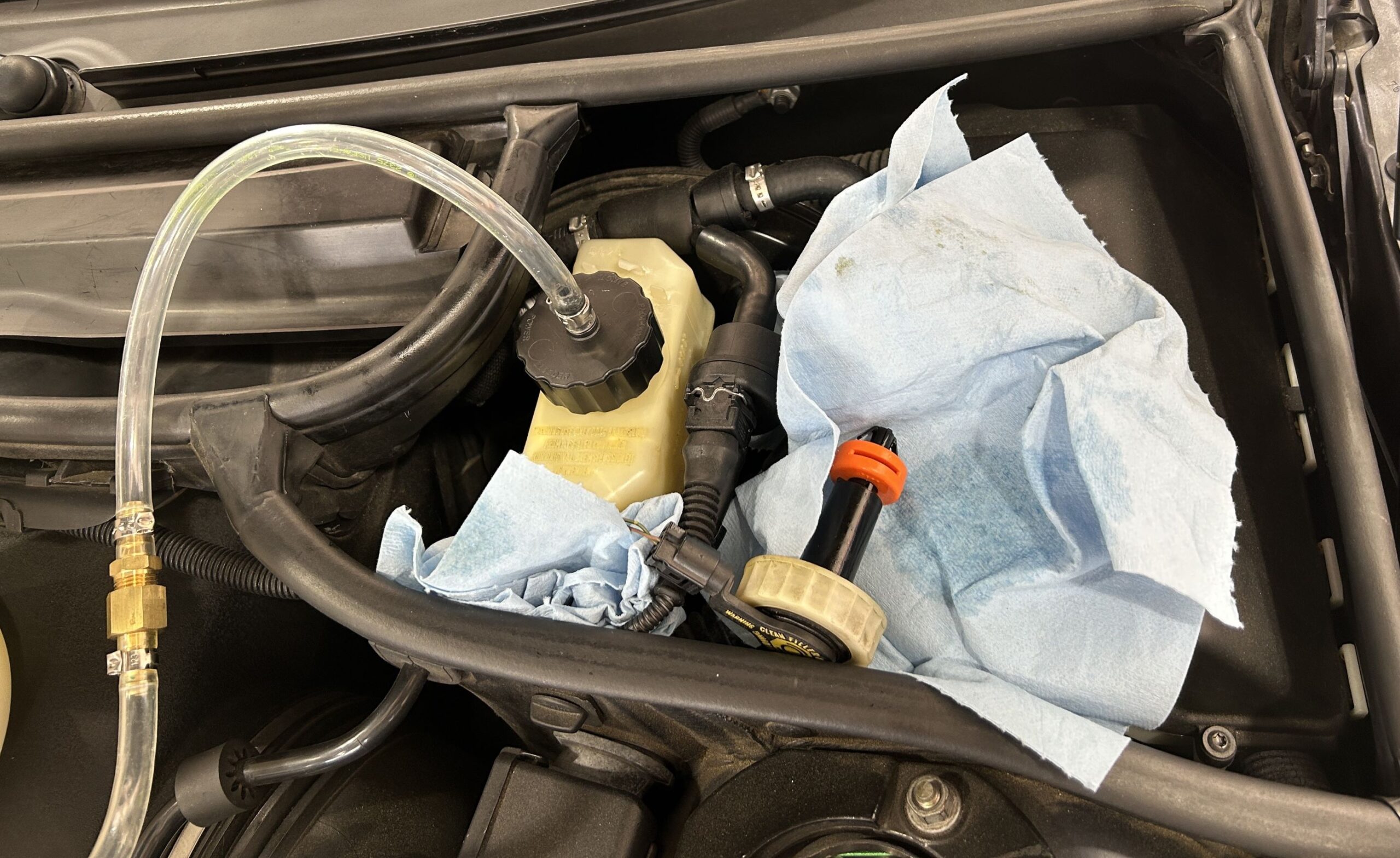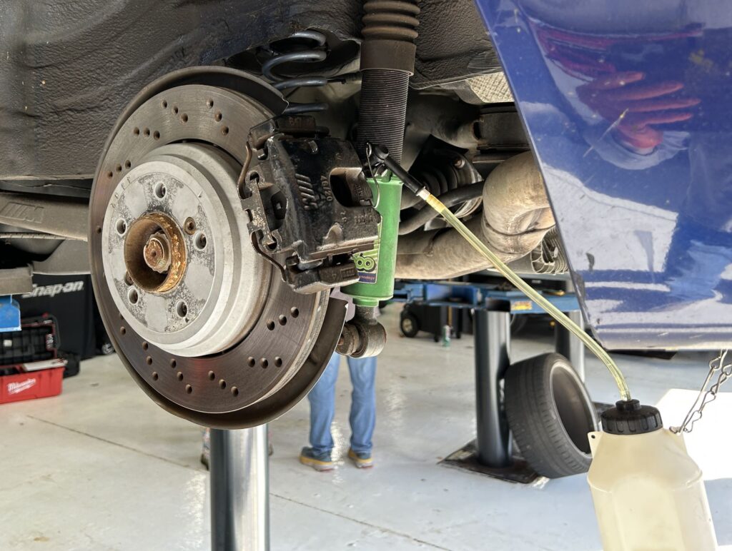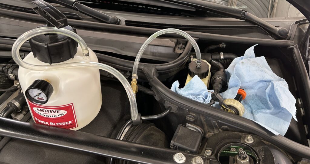Once you remove the wheels, you can easily access a 9mm screw at the back of the brakes. The fluid catch bottle has a rubber nipple that fits over this screw and catches the old fluid. Doing this before you loosen the screw saves a lot of mess. You work your way around the car, farthest from the reservoir to closest – rear passenger, driver passenger, passenger front, and then driver front. Once you have roughly a liter of fluid, you’re done.